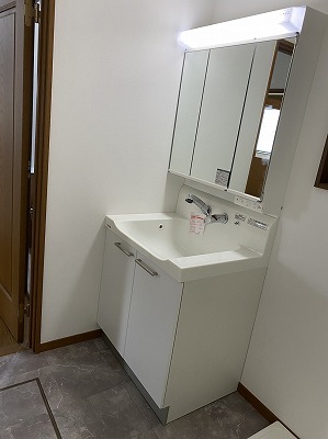 洗面台がキレイになると、なにか幸せな感じがしますね。笑顔になるといいね!洗面化粧台です。